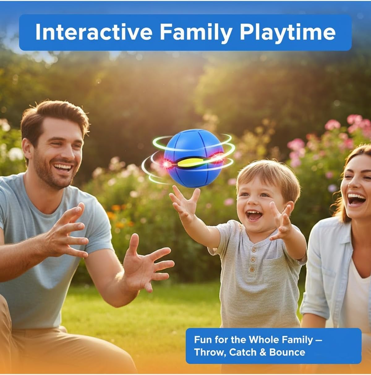 Interactive 2-in-1 Design: Transforms from a colorful, light-up bouncing ball into a flying saucer with a simple press.